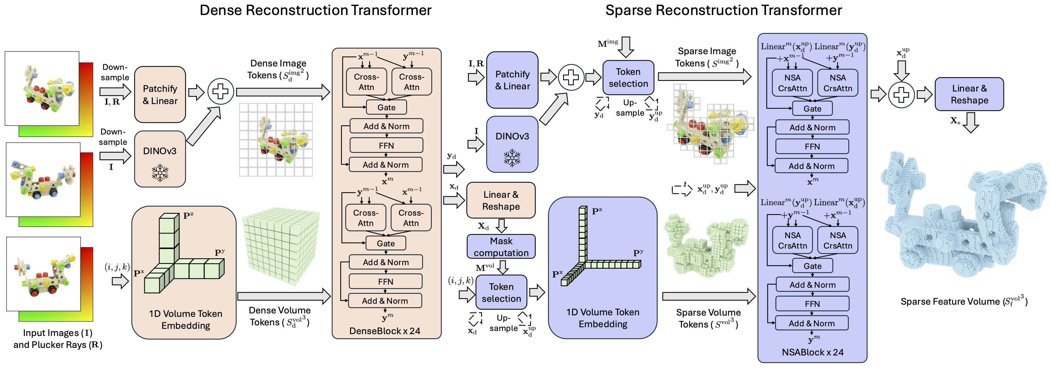 Network architecture of LSRM is shown above. Our method employs a two-stage coarse-to-fine pipeline. In Stage 1, a Dense Reconstruction Transformer generates a coarse, low-resolution volume. Stage 2 utilizes this coarse volume to initialize the active sparse volume tokens and predicts high-resolution sparse residuals, constructing the final 3D representation.